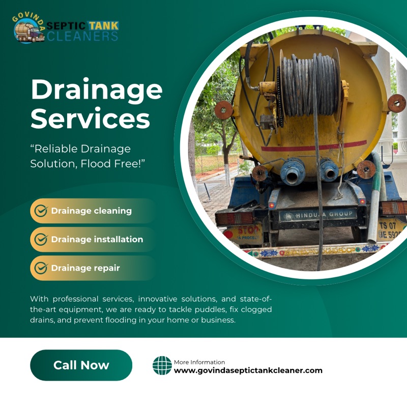 Looking for expert drainage cleaning services in Hyderabad? Govinda Septic Tank Cleaners is your trusted partner for drainage cleaning, septic tank cleaning, and complete waste management solutions. Our skilled team uses advanced equipment to clear blockages, eliminate bad odors, and ensure smooth water flow in your home or commercial property. Whether it’s a minor drain issue or a major cleaning project, we provide quick, safe, and affordable drainage cleaning Hyderabad residents can rely on.
